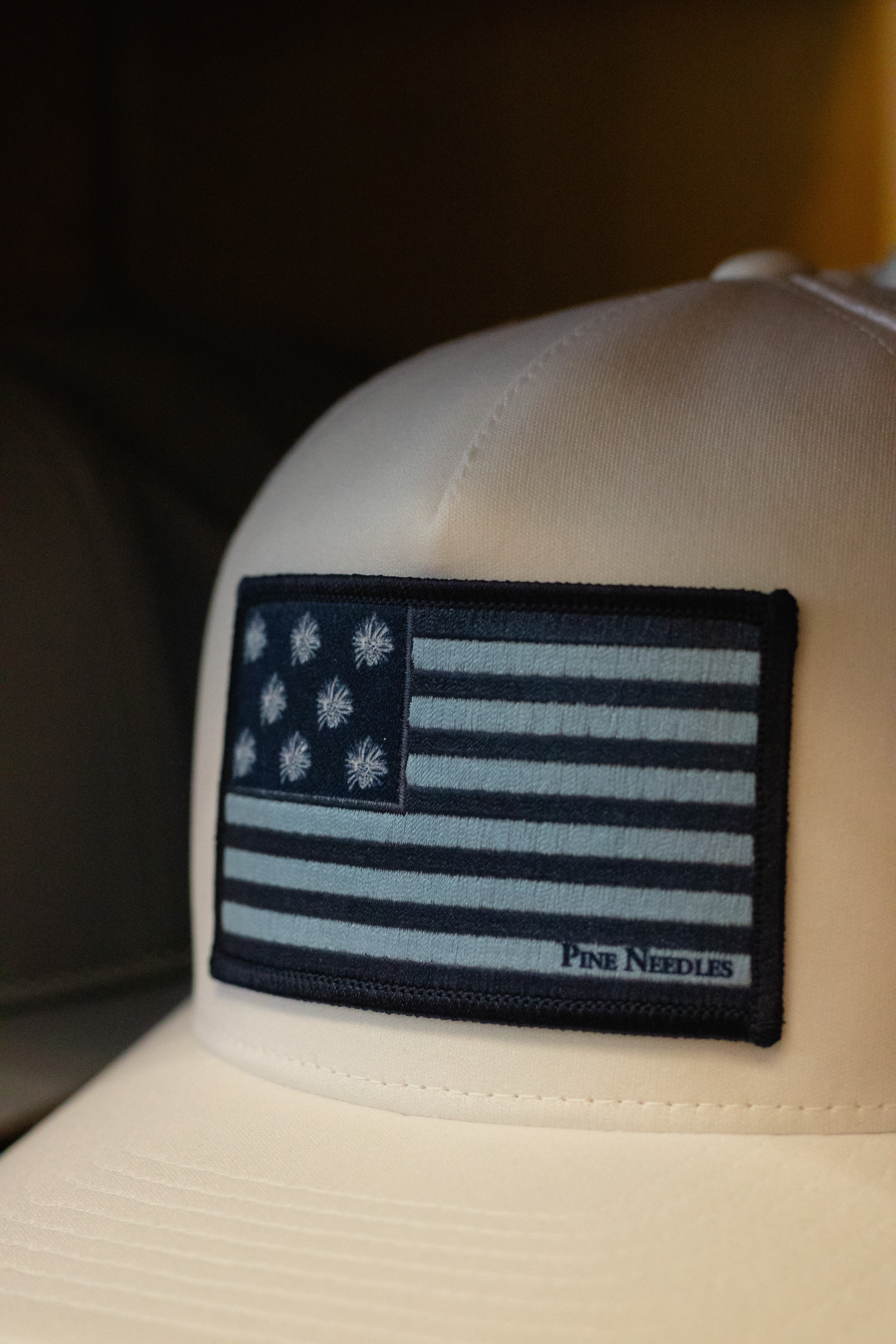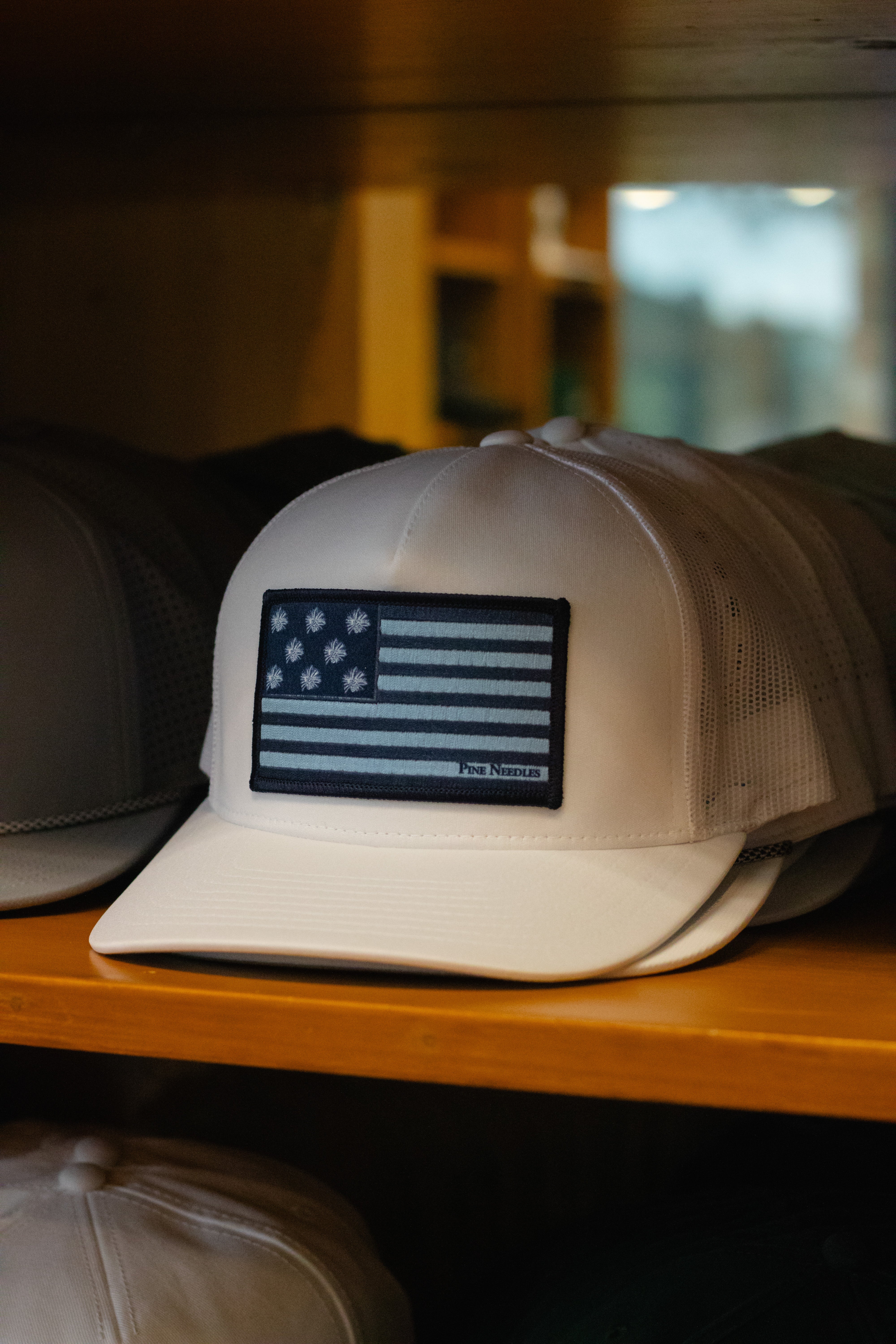Pine Needles Greyson Hat with blue American Flag Patch.